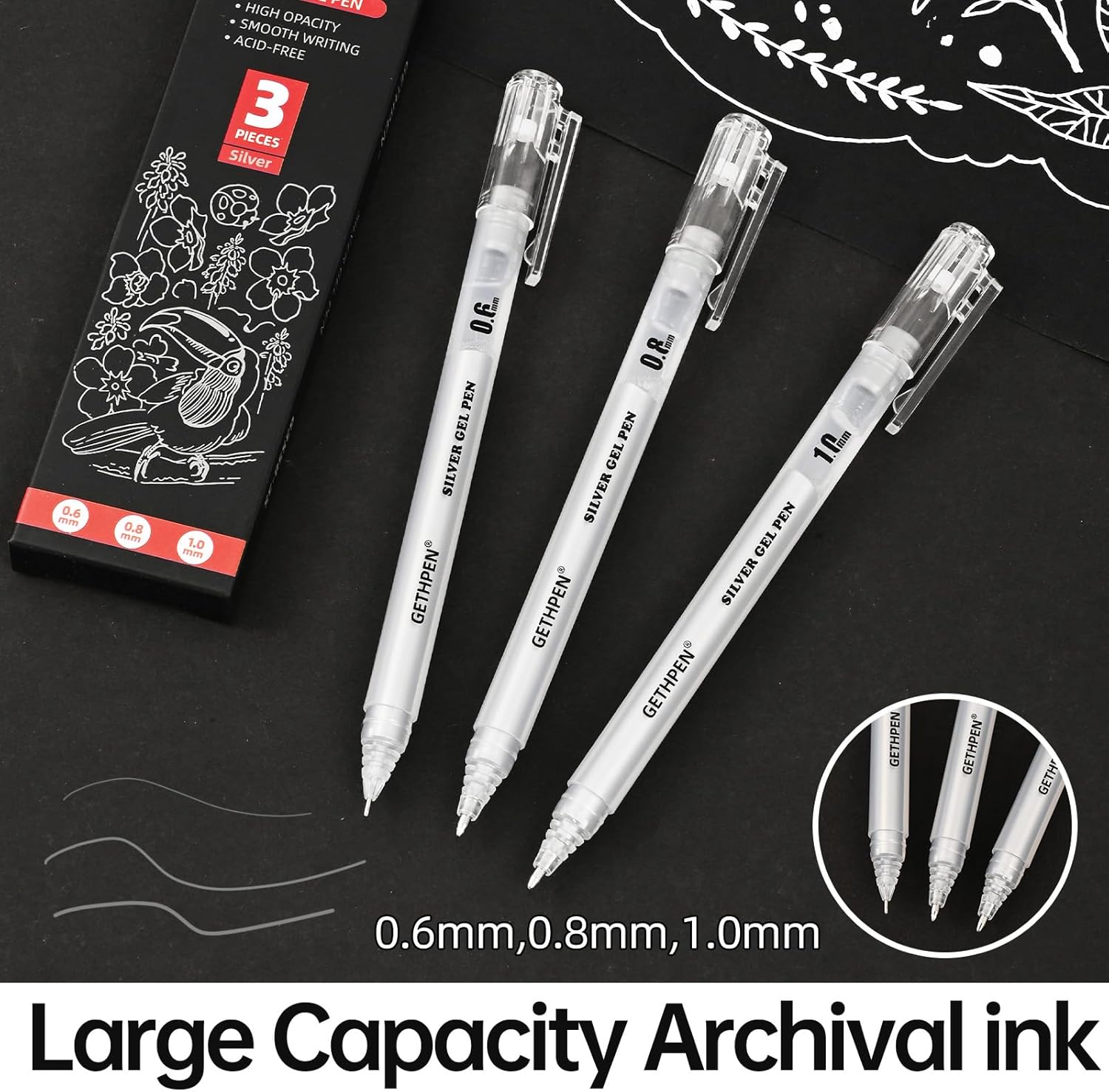 - Silver Gel Pens Set: 0.6mm for micro tech sketching, 0.8mm for sleek lettering, and 1.0mm for bold industrial art. The opaque silver ink creates luminous contrast on dark papers, perfect for Drawing, Sketching, Illustration