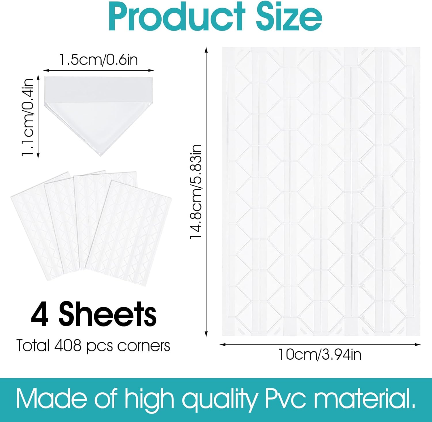 - 【Bulk Pack with Perfect Dimensions】Includes 408 picture mounting corners (4 sheets of 102 each) measuring 0.43"×0.43"×0.59". This generous quantity covers all your DIY projects while the precise sizing fits most standard photos securely.