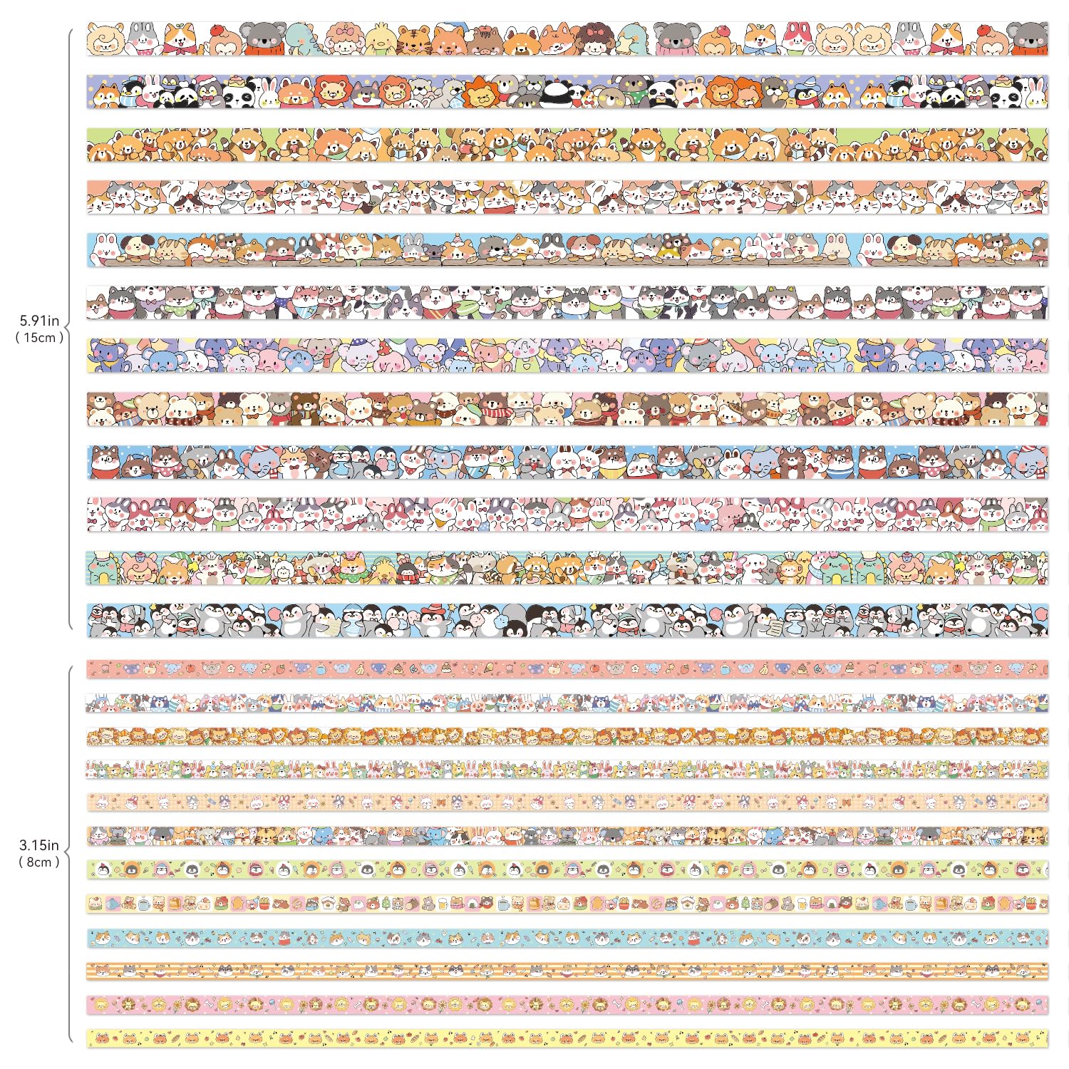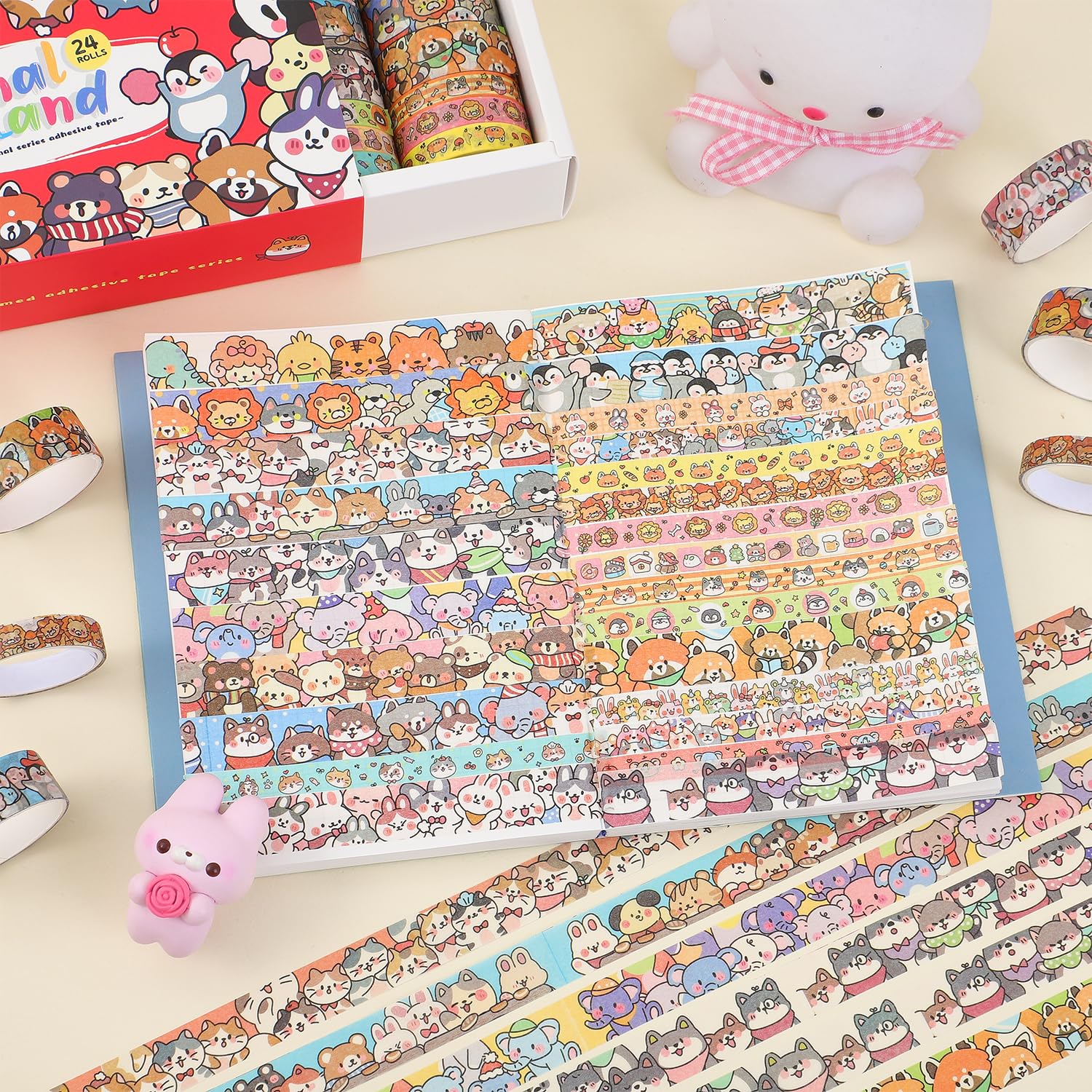 - This adorable cartoon washi tape features a variety of cute animals, including penguins, kittens, elephants, bunnies, raccoons, little bears, and tiny mice — perfect for adding a playful touch to your journals, planners, and craft projects!