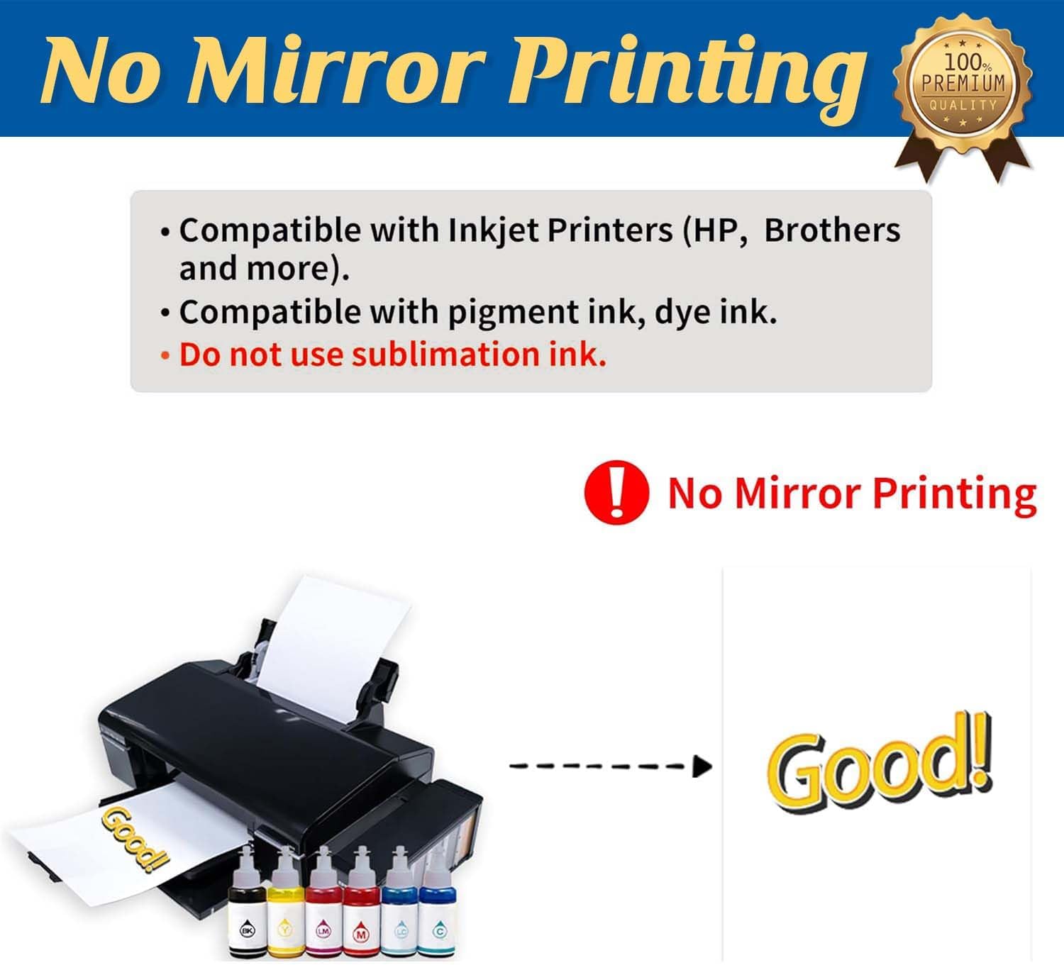 - 💕REQUIREMENTS: Inkjet Printers (such as HP, Brother and other brands) | Pigment Ink or Dye Ink (Do NOT use sublimation ink.) | Scissors or Cutting Machine | Iron or Heat Press machine | Teflon Paper (included in the pack).