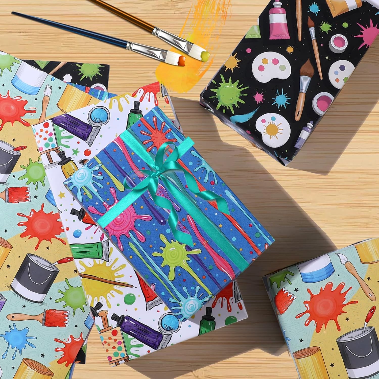 - Vibrant Artistic Designs: This set includes 12 sheets of high-quality painting wrapping paper, featuring 4 unique designs (3 sheets each) showcasing colorful paint tubes, brushes, palettes, and whimsical art doodles. Perfect for any art lover's gift!