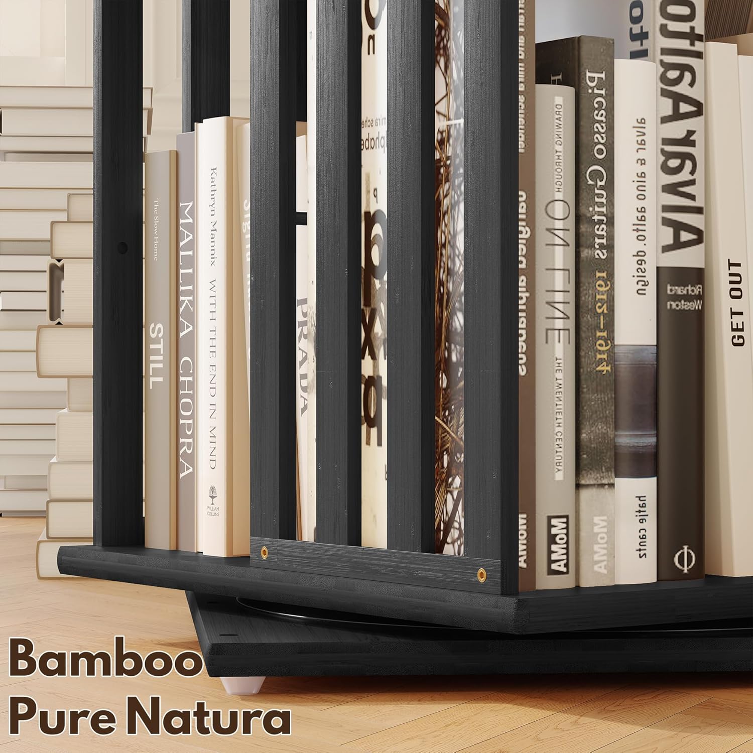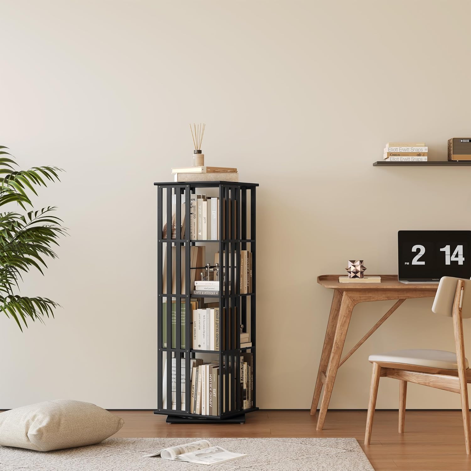- 360° Rotating Bookshelf with Stable Base: Enjoy effortless organization with this rotating bookshelf tower—smooth 360° spin lets you find books, movies, or décor in seconds without bending or rearranging. The sturdy bamboo base and reinforced structure keep your spinning bookcase stable and wobble-free, even when fully loaded. Ideal for living rooms, bedrooms, home offices, or small apartments.