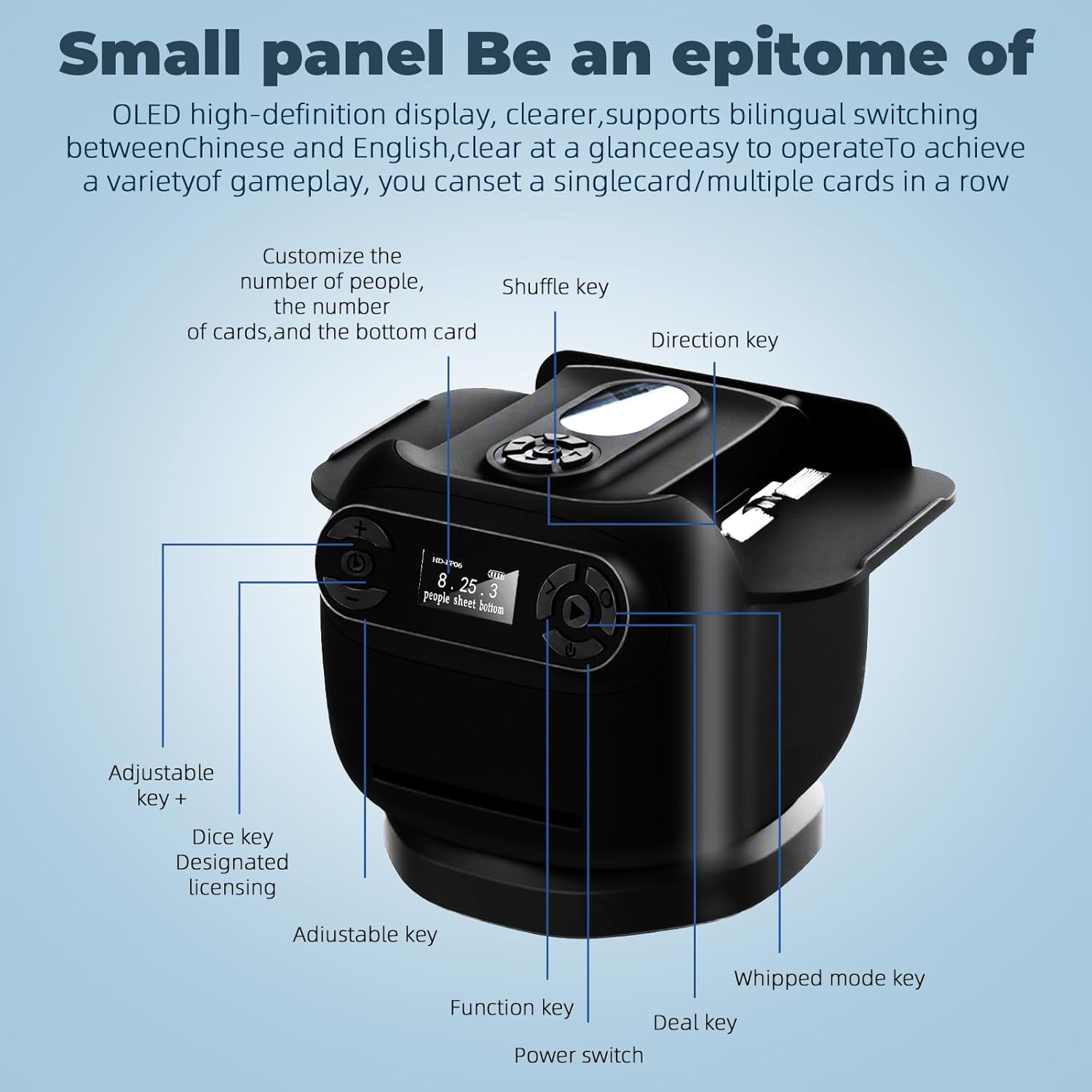 - 【LARGE SCREEN DISPLAY & SMART SETUP】This one Smart Shuffler Easily Customize Players, Card Quantities, And Shared Cards With An Intuitive Setup,With A Card Tray Capacity Of 2 Decks, Auto-Deals For Up To 148 Decks, And Pause Dealing Cards By Touching A Designated Area, Resuming With A Click On The Same Pause Sensing Spot.The Large Screen Allows Users To Set Up And Enjoy Multiple Gaming Modes, Enhancing The Overall Gaming Experience.
