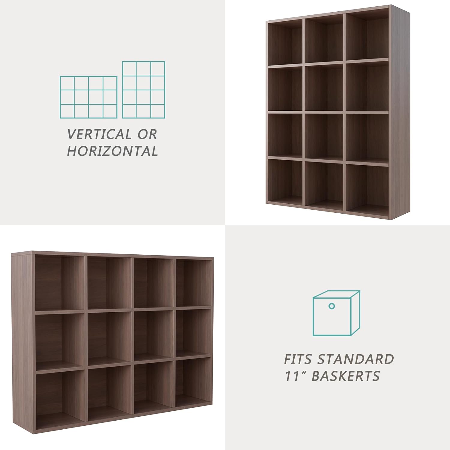 12-Cube Storage Shelf Bookcase - Wooden 3-Tier Floor Standing Open Bookshelf for Home and Office, Cuby Orgainzer, Walnut
