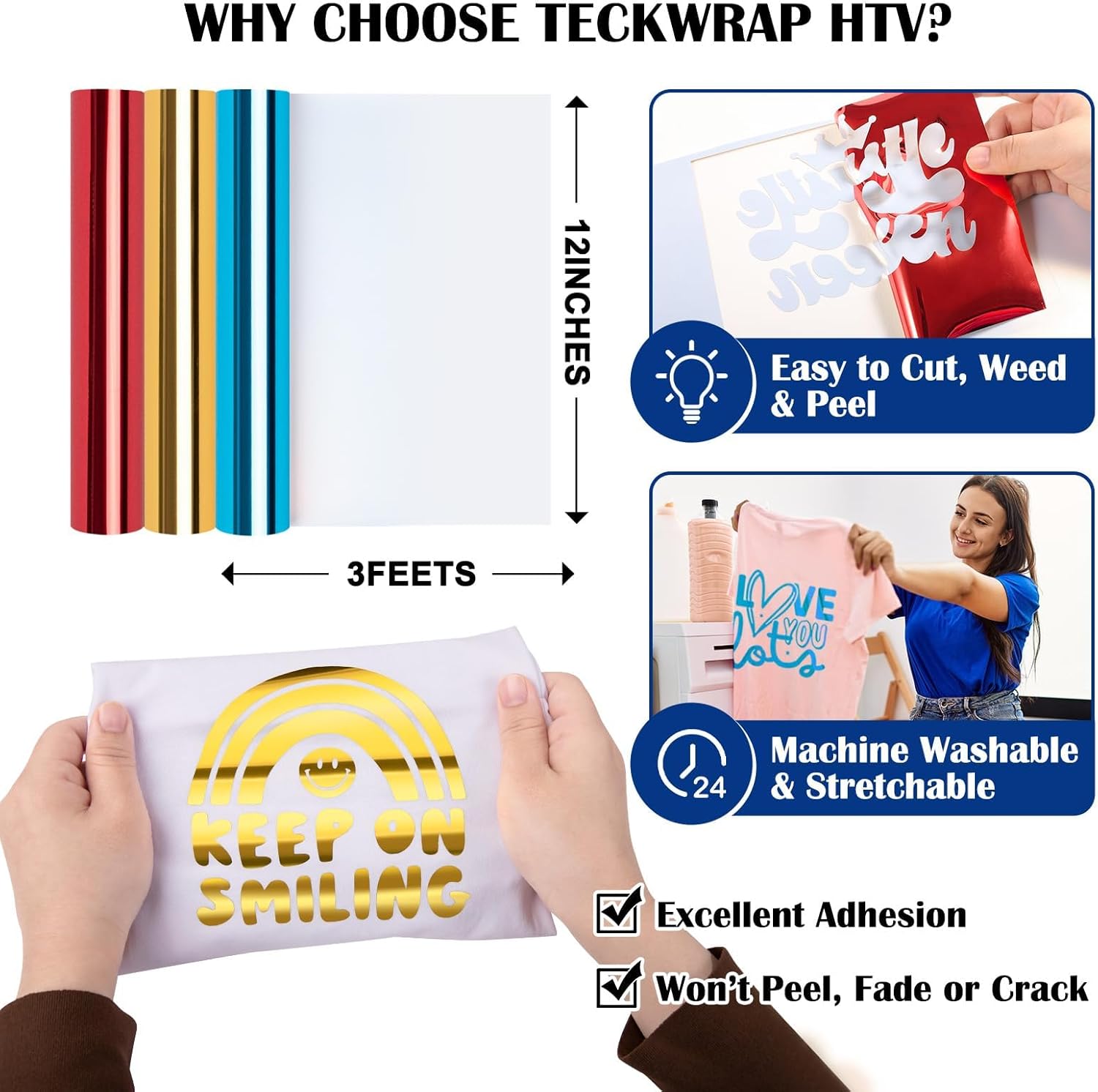- Long-Lasting Durability & Wash-Resistant: TECKWRAP heat transfer vinyl features premium adhesive for a secure bond on T-shirts, hoodies, bags, and craft projects, resisting multiple washes without fading or peeling—ideal for DIY heat transfer vinyl designs.