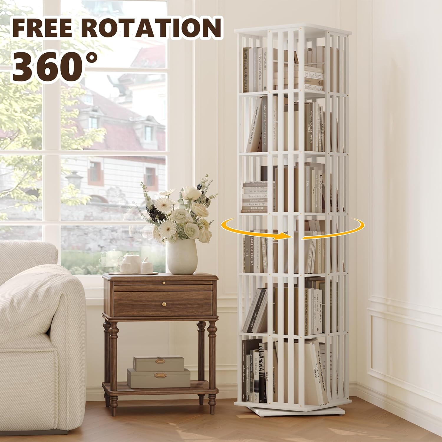 - 360° Rotating Bookshelf with Stable Base: Enjoy effortless organization with this rotating bookshelf tower—smooth 360° spin lets you find books, movies, or décor in seconds without bending or rearranging. The sturdy bamboo base and reinforced structure keep your spinning bookcase stable and wobble-free, even when fully loaded. Ideal for living rooms, bedrooms, home offices, or small apartments.