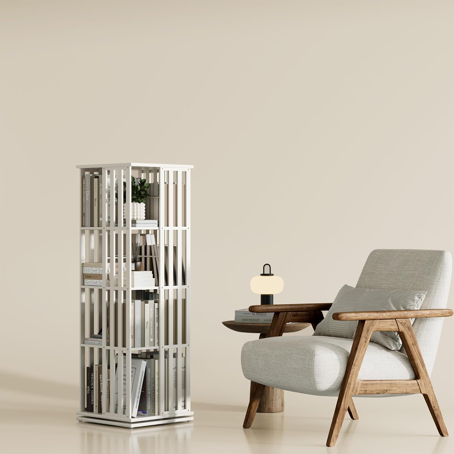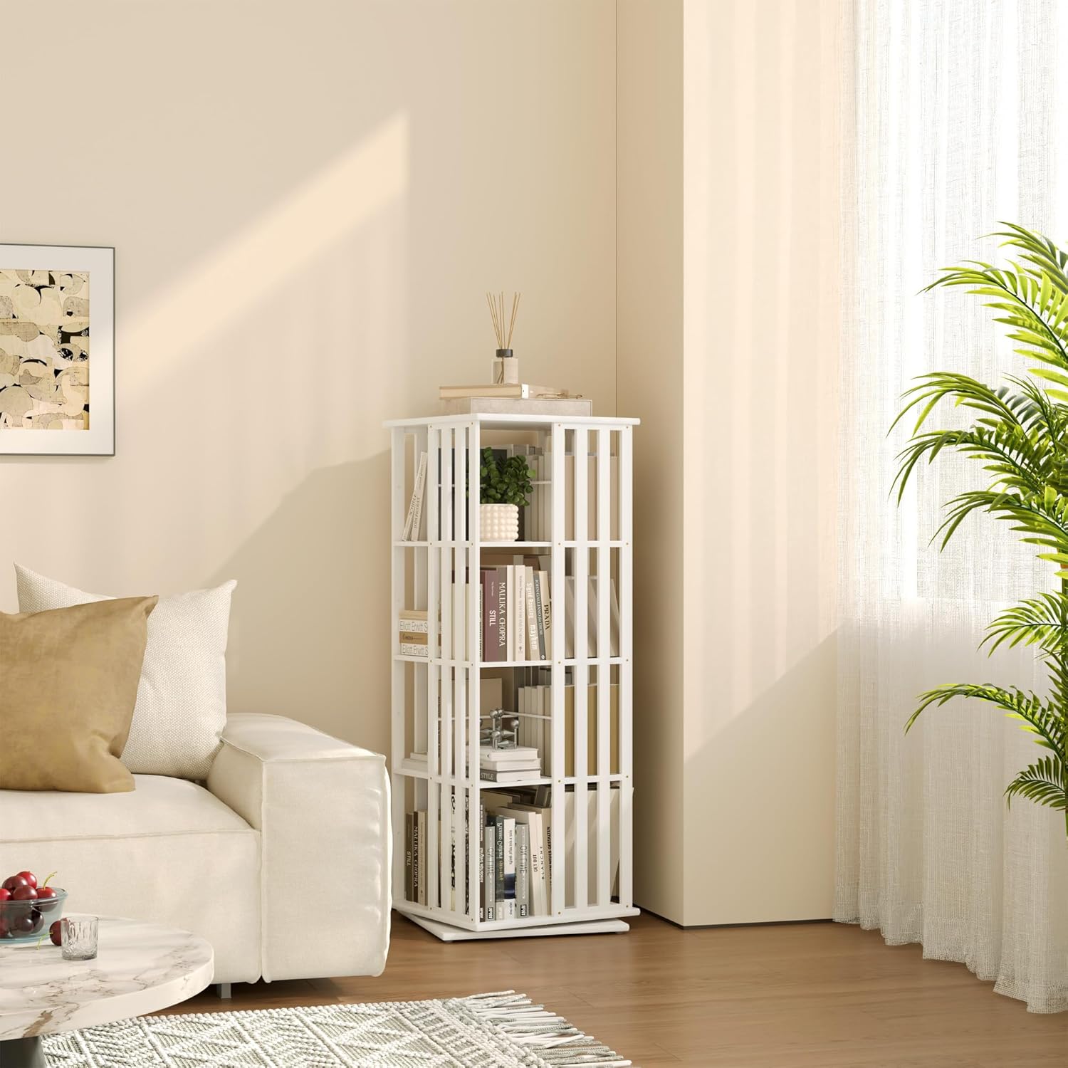- 360° Rotating Bookshelf with Stable Base: Enjoy effortless organization with this rotating bookshelf tower—smooth 360° spin lets you find books, movies, or décor in seconds without bending or rearranging. The sturdy bamboo base and reinforced structure keep your spinning bookcase stable and wobble-free, even when fully loaded. Ideal for living rooms, bedrooms, home offices, or small apartments.